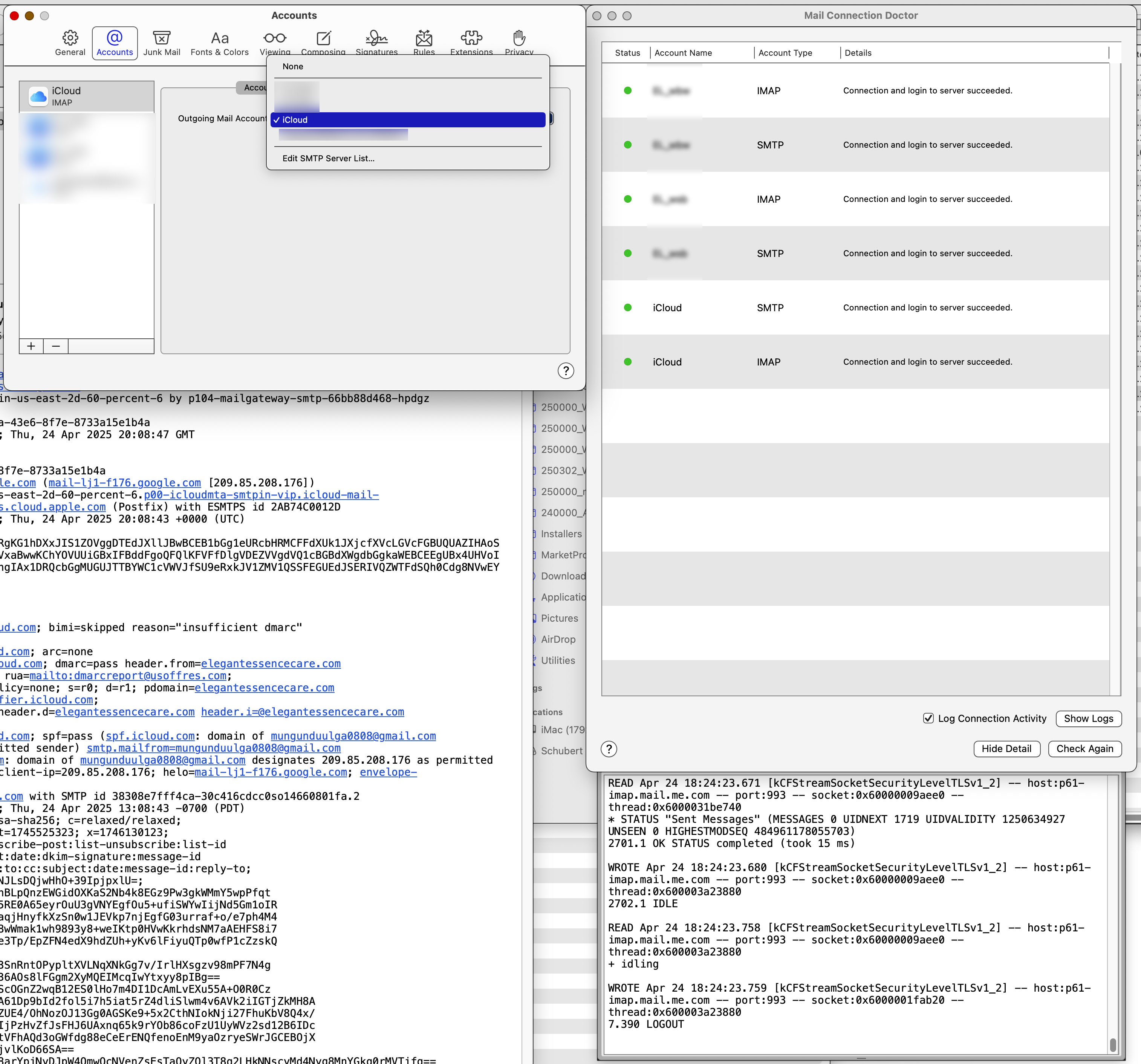 - Connection Doctor shows no issues with the iCloud SMTP server.