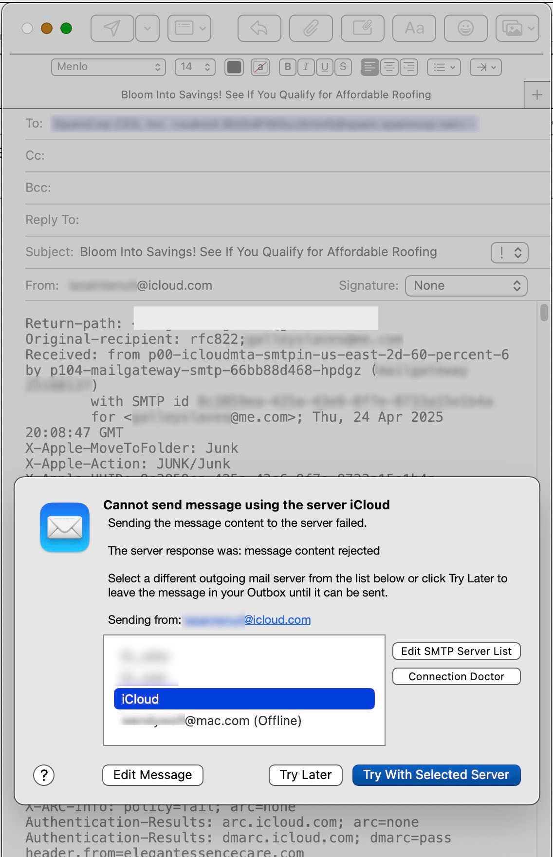 Yesterday, Mail kicked up this same SMTP objection for a similar message containing the raw source code of spam being sent from the same iCloud account to the same addressee. The “message content rejected” was a mystery: I have sent hundreds of emails with raw source code of spam from all kinds of offenders for analysis and reporting to the same service without once having a problem. I had copied the subject line from the raw source content and wondered if that might be causing a problem; I deleted the subject line and keyboarded it. It was delivered.