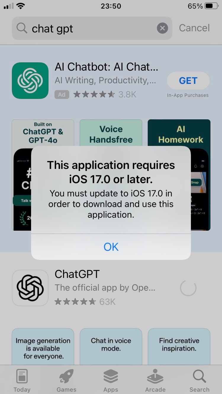 Your second screenshot includes an error message saying that "This application requires iOS 17.0 or later. You must update to iOS 17.0 in order to download and use this application."