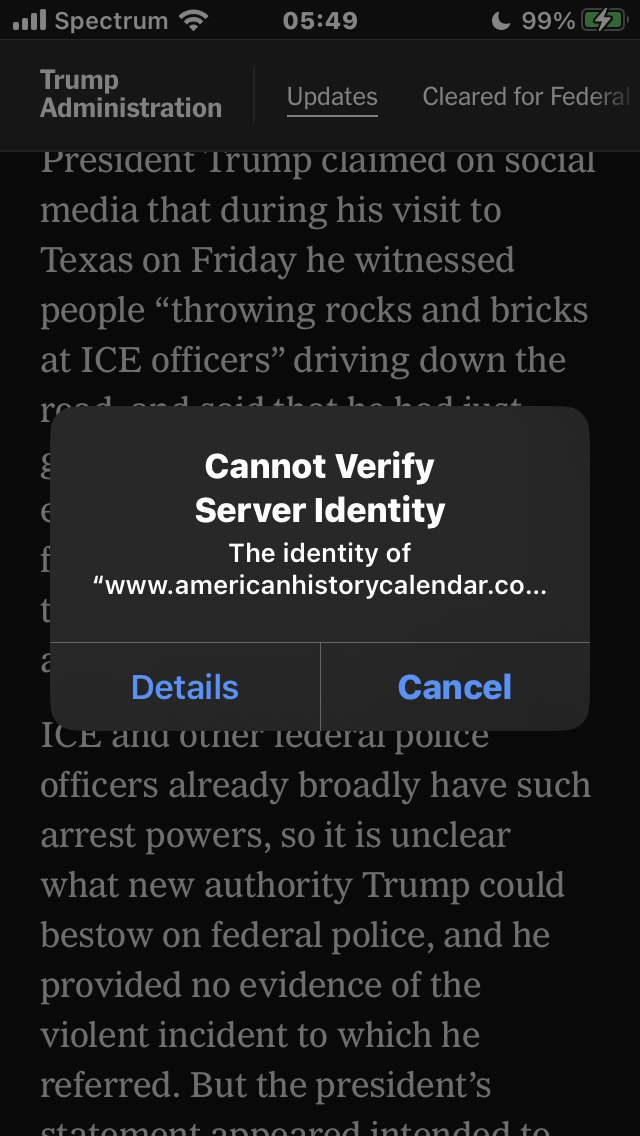 Does the notification about the server identity appear when doing a specific task? It looks like you may be in Safari, or some other app. I'm wondering if it may have something to do with an advertisement that is trying to open from a website but it not coded correctly and is causing that error. I'm guessing that you tapped on Details in the original popup to get that certificate error? What happens if you tap on Cancel? Since it does not appear that you don't have a calendar subscription problem that it may be a popup from the page you are on when it happens. I've not experienced a problem being on the website, I've left it open in the background on my computer and it hasn't been a problem.