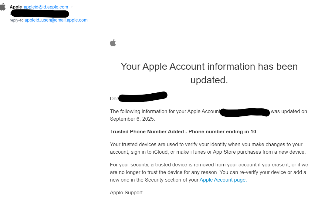 I received a weird email that a new phone # was added to my apple ID. Its not the Apple I am logged into now, it is a different but similar email address.