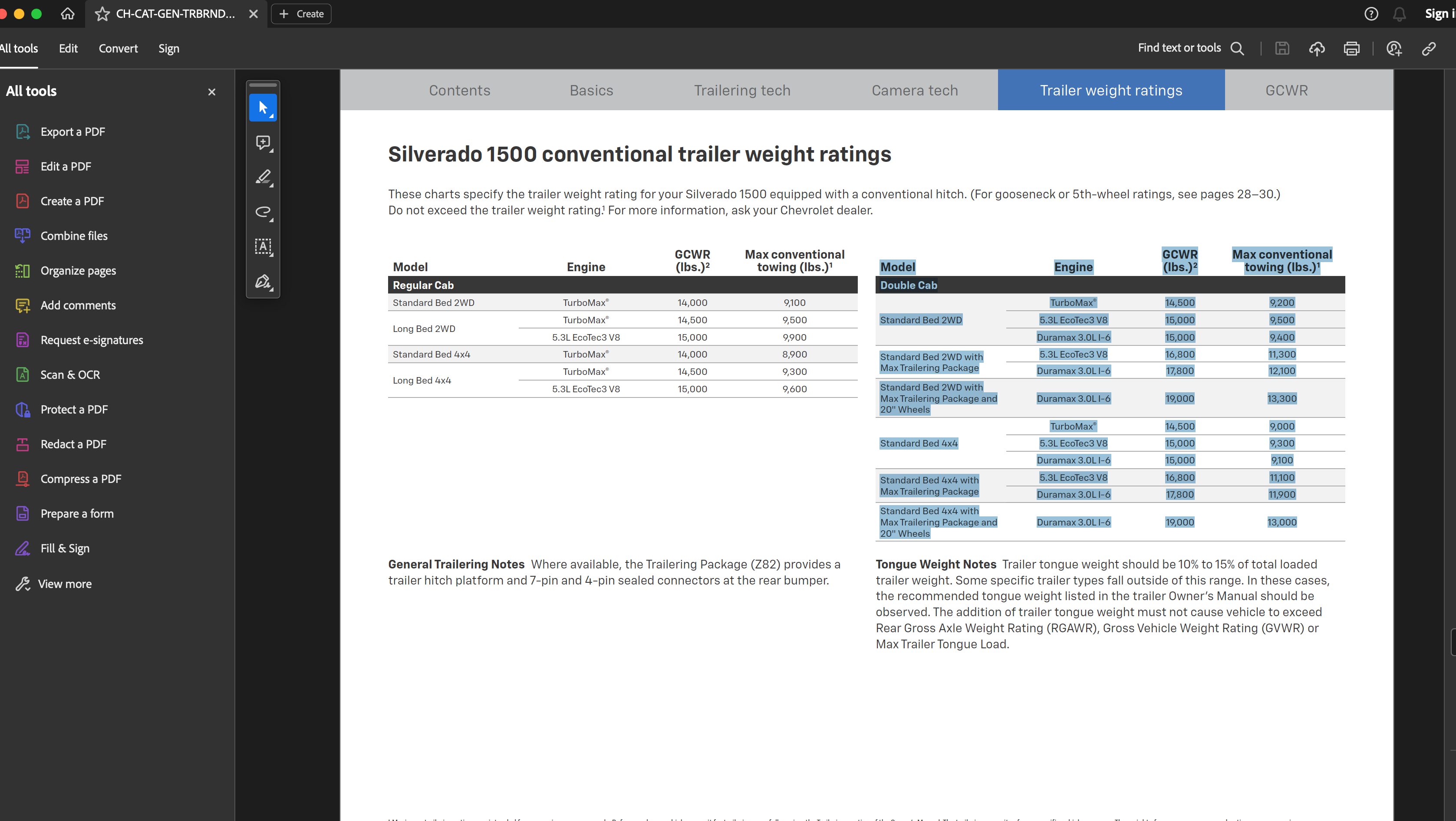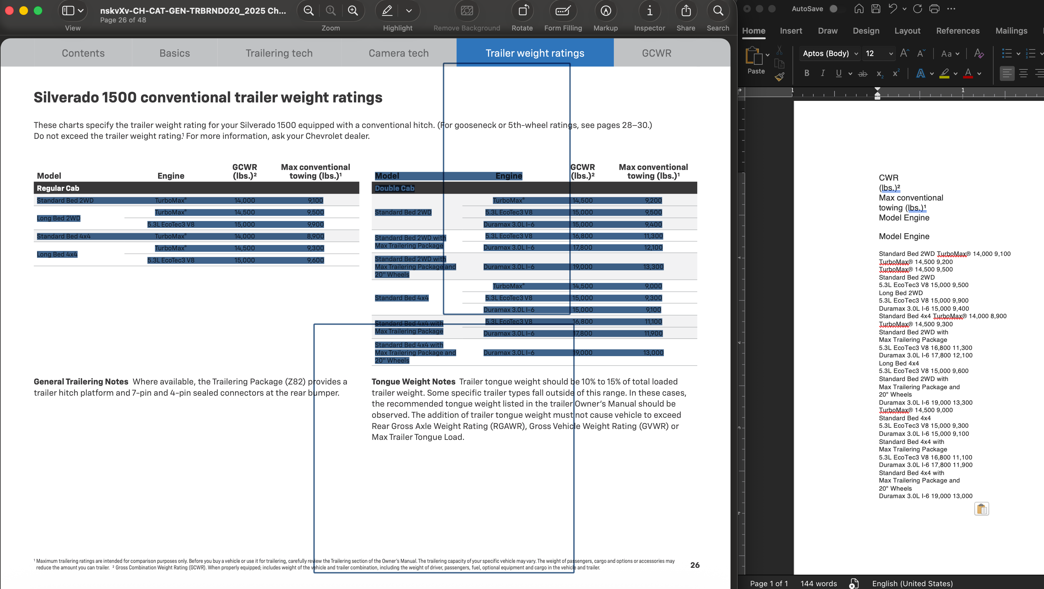 If Preview is problematic, you can try Adobe Acrobat Reader (in this case perhaps because the Chevy pdf was made with Acrobat Distiller from Adobe InDesign, though it was done on a Mac). For the pdf you linked, it properly selects the right table (and the paste into Word reflected that, with just the right table though the column breaks were ignored).
