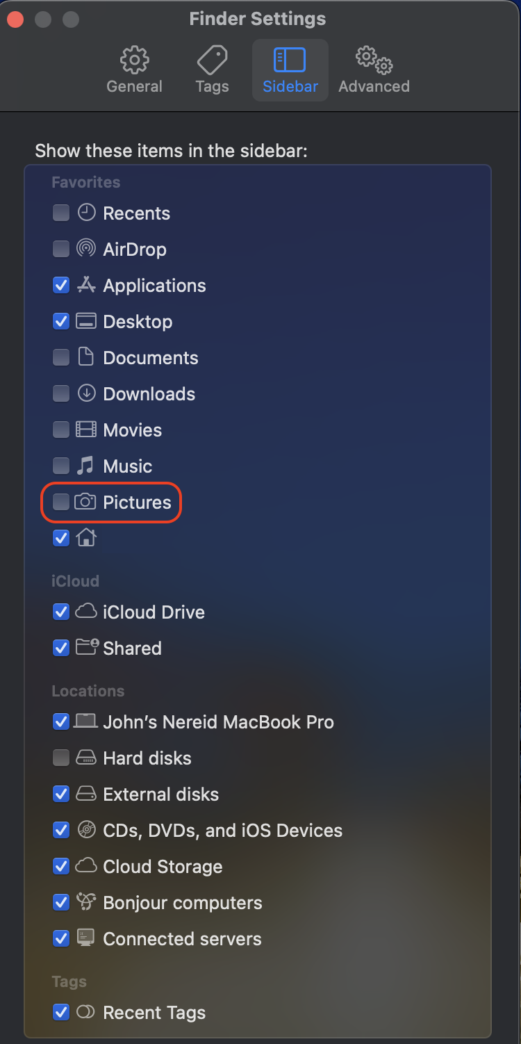 Photos gone from Finder sidebar in OS 26 Tahoe