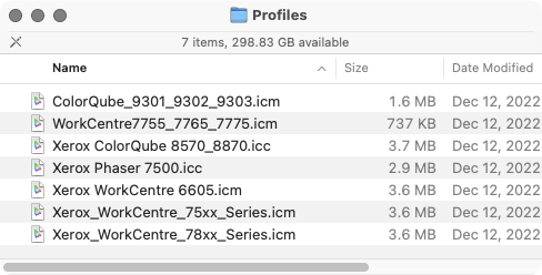 Why don't they appear? Quite a few versions of macOS / OS X back, the OS was set up to look in any of the /Library/Printers subfolders for profiles or profile bundles so it would know what to report as available. For the most part, this doesn't work anymore, and hasn't for a while. Such as these for our Xerox printer. These are within the /Library/Printers folder, but none of them appear in any app.
