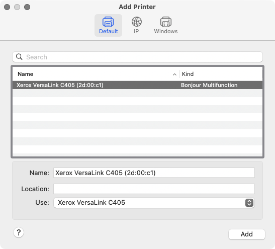 I only installed the drivers for our printer straight up. The OS had already selected the correct driver for the Xerox C405, so I didn't re-select it in the drop down menu.