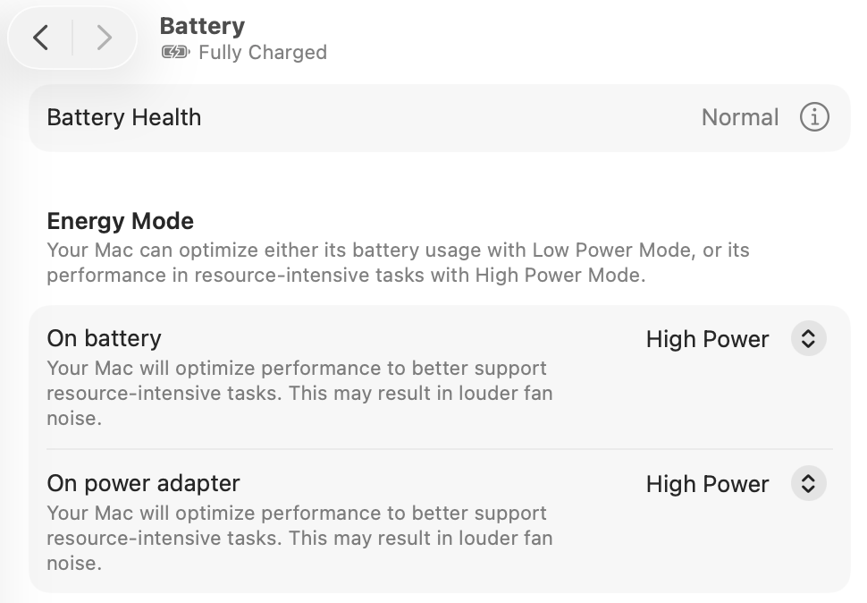 ❯ pmset -g custom | grep -B2 -E 'powermode'