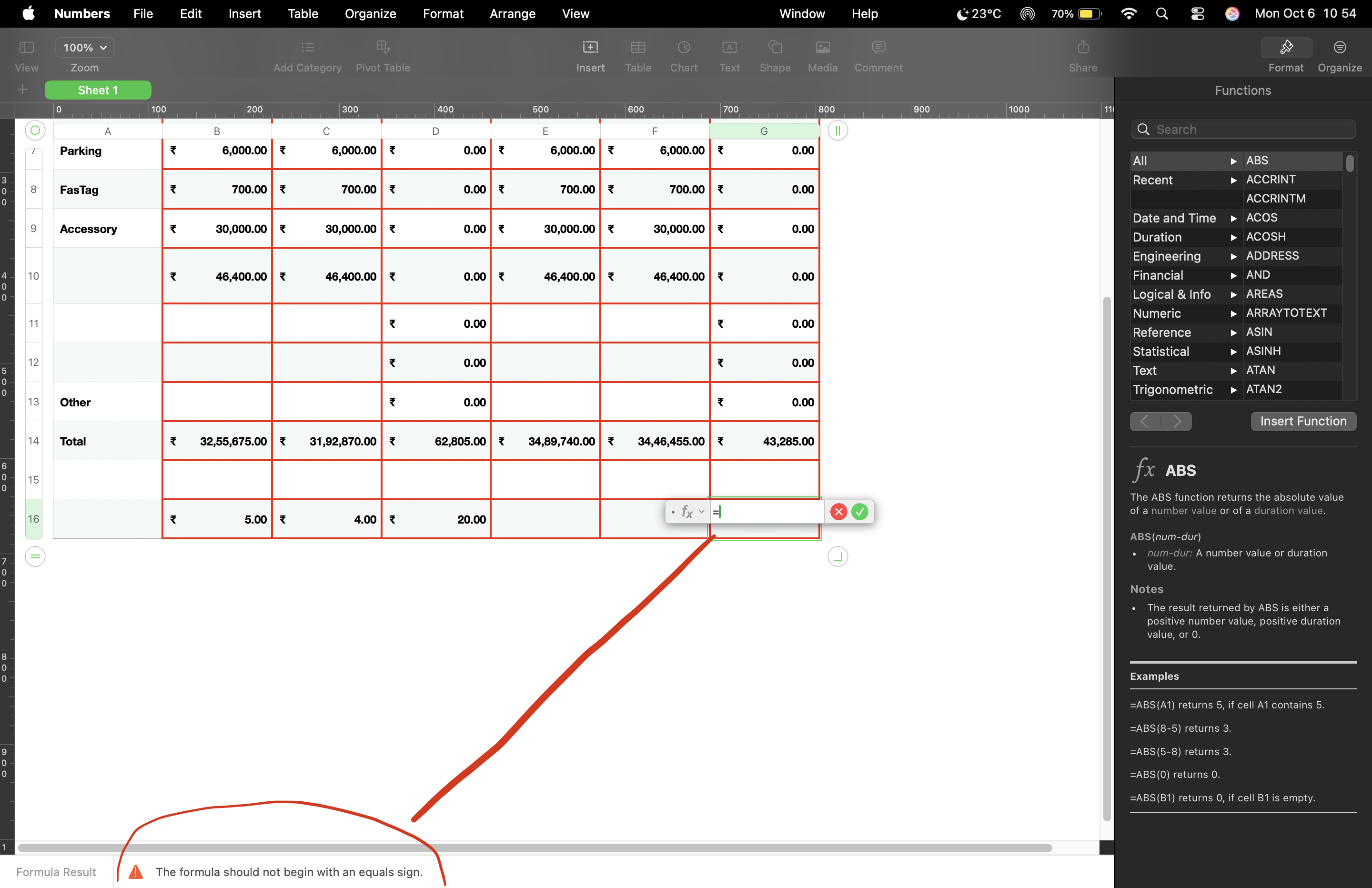 Whenever I try inserting a formula by pressing equals sign, the bottom formula result bar says 'the formula should not begin with equals sign'. It gives same error message irrespective of cell format (auto, numbers, currency etc). Please check screenshot. Just to inform, it calculates and gives correct results in both conditions when formula started with equals sign and when without equals sign. Why's it giving that message???