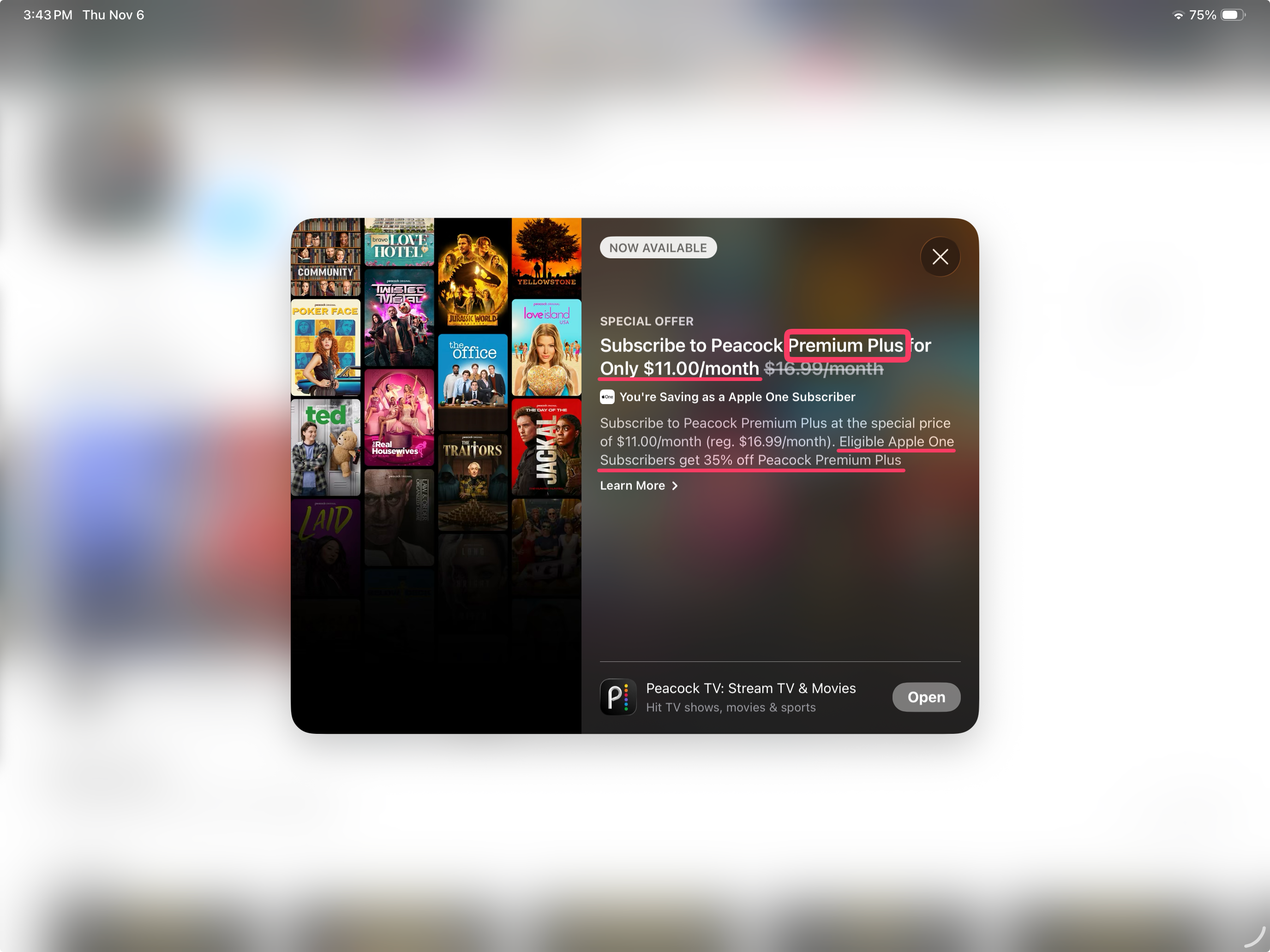 As you can see it says I can add Peacock Premium Plus (no ads) to my Apple One subscription for $11/month. YAY! But ... how do I GET it? Open just opens the Peacock app on my iPad. Learn More describes what Peacock Premium Plus is. Nothing else on this screen reacts to touch.