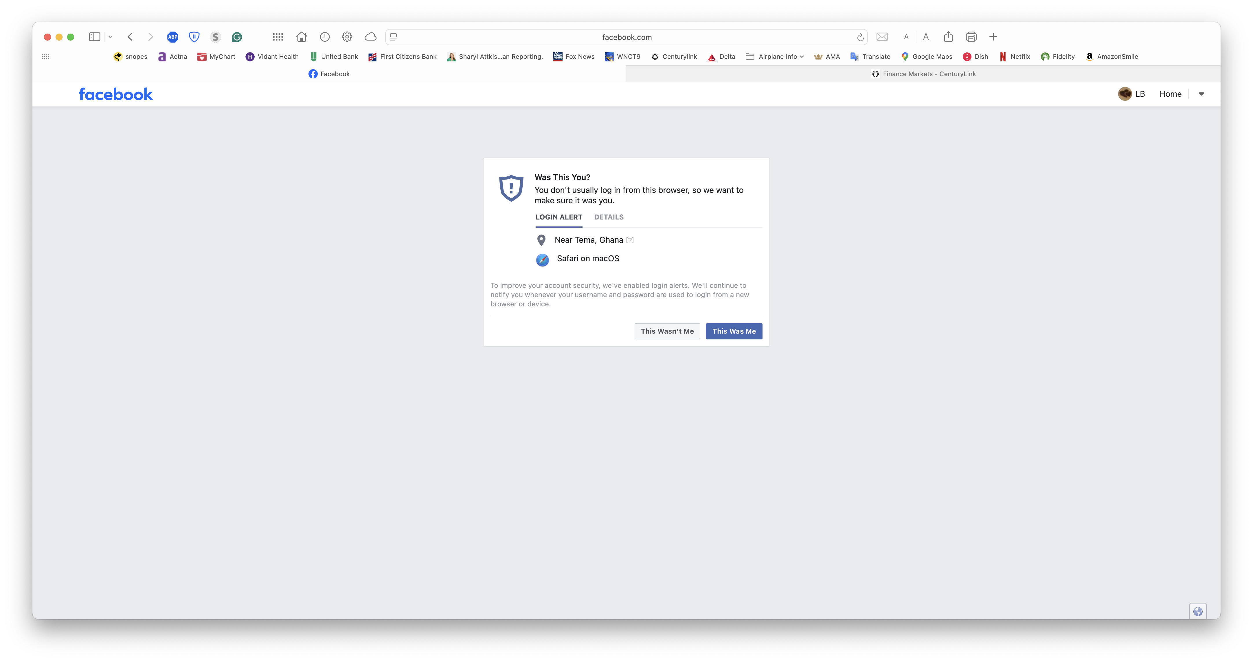 When I log into Facebook through Safari on my macOS, I keep getting a message stating Is this you? Location is in Ghana. Looks like it also shows on my iPad. Seam very dangerous to continue? HELP