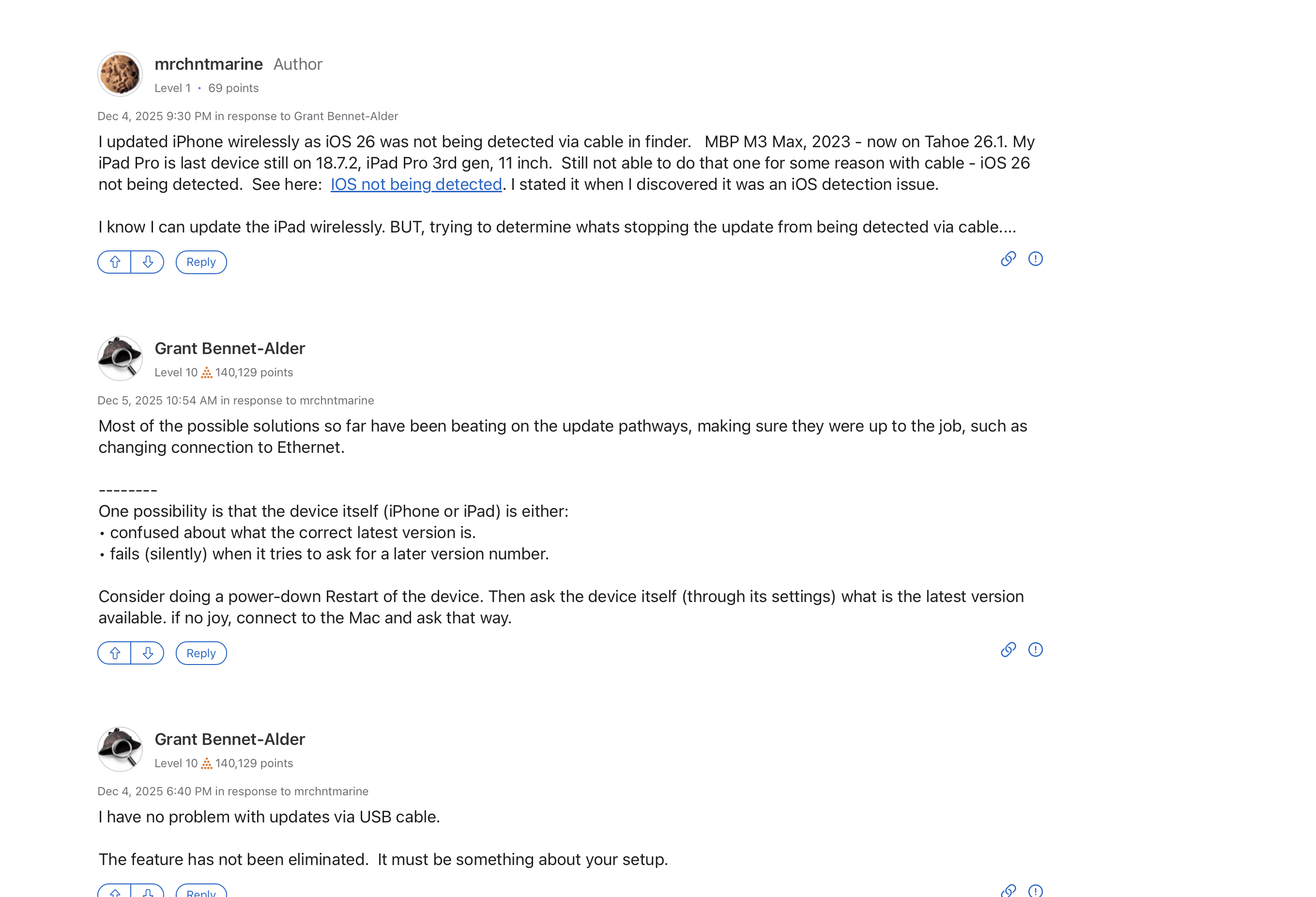 I updated iPhone wirelessly as iOS 26 was not being detected via cable in finder. MBP M3 Max, 2023 - now on Tahoe 26.1. My iPad Pro is last device still on 18.7.2, iPad Pro 3rd gen, 11 inch. Still not able to do that one for some reason with cable - iOS 26 not being detected. See here: IOS not being detected. I stated it when I discovered it was an iOS detection issue.