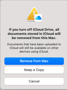If you turn off iCloud Drive or sign out of iCloud, a new Desktop and Documents folder is created in your home folder. You also have the option to keep a local copy of your files that are in iCloud Drive. If you keep a local copy of your files in iCloud Drive, they're copied to a folder called iCloud Drive (Archive) in your home folder. You can move any files that were in your iCloud Desktop and Documents to your new local Desktop and Documents.