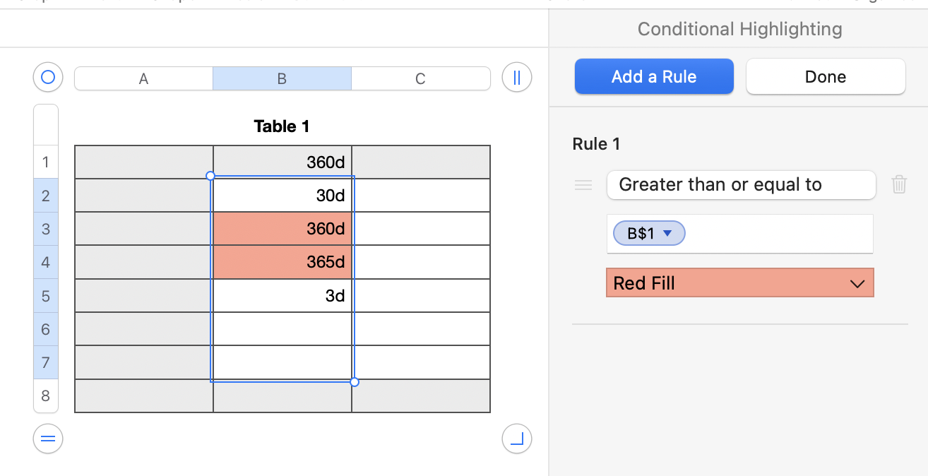 Conditional highlighting for exceeding 360 days in Numbers cell with formula