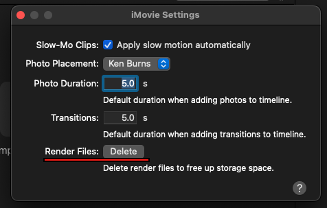 Q2. I have been testing iMovie this past month. Today got "Your Disk Is Almost Full " message. iMovie Library size had bloated up to the extreme. After manually frantically, deleting files in iMovie found out by trial and error the solution was to delete Render files.