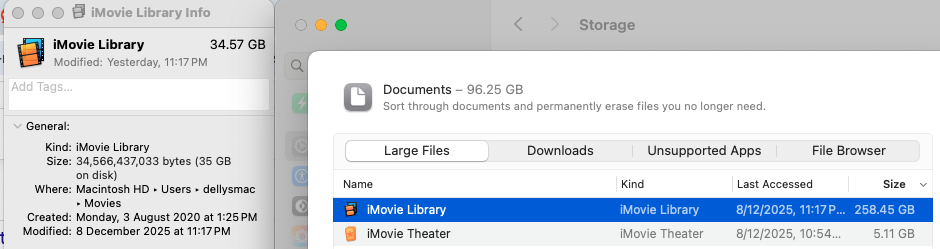 Q1. What could be causing this iMovie Library file size discrepancy? It shows as 35GB on the Finder info but 258.45GB on the storage menu in System Settings/General/