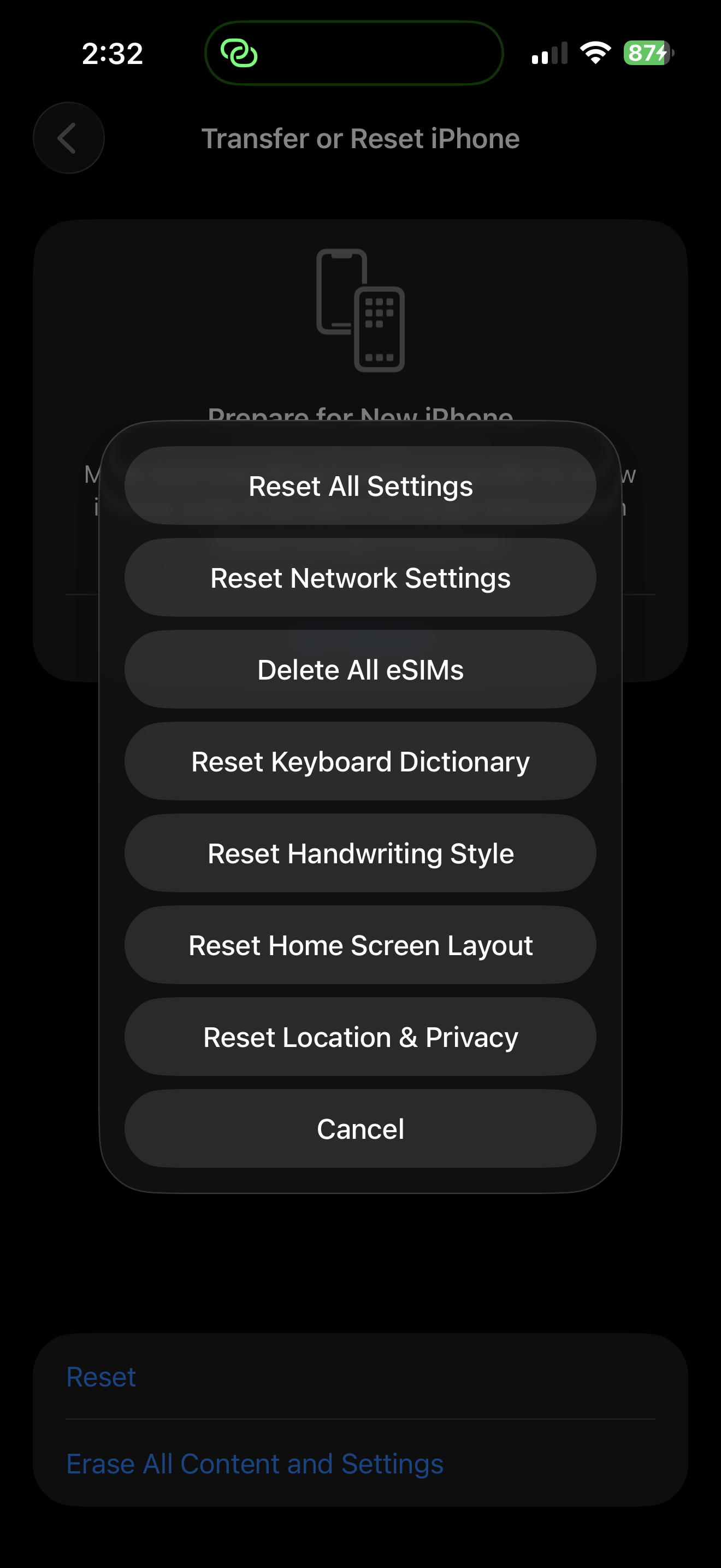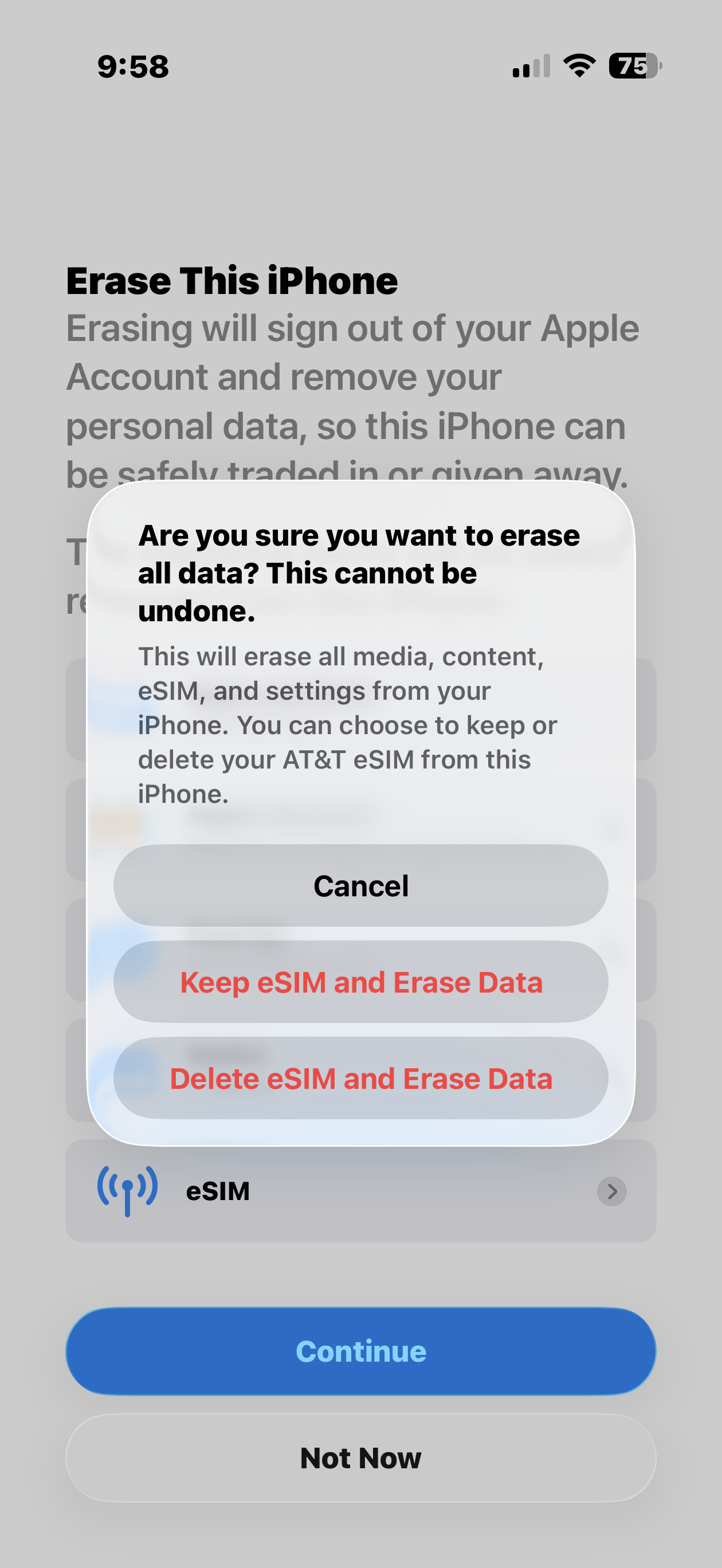 I don't mean Erase iPhone. I mean Delete All eSIMs which is a third option after Reset All Settings and Reset Network Settings.