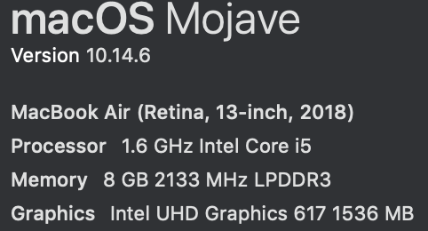 My computer is a MacBook Air 2018. I am still running the last Mojave, 10.14.6 . (The reason I never updated past that was because I didn't trust that things would always get better. The one time I updated a Mac OS previously was with an iMac 2011, updating to the newest OS in 2016. This update helped some things, but made other things worse, so I decided to avoid updating the OS.)