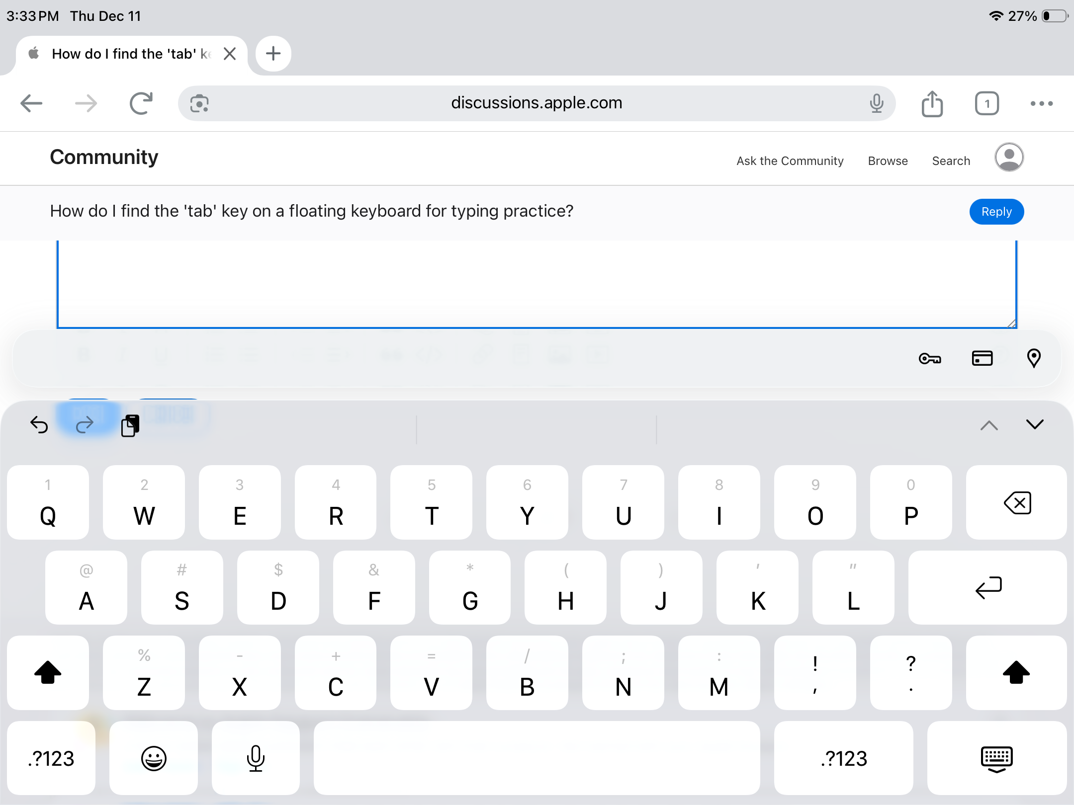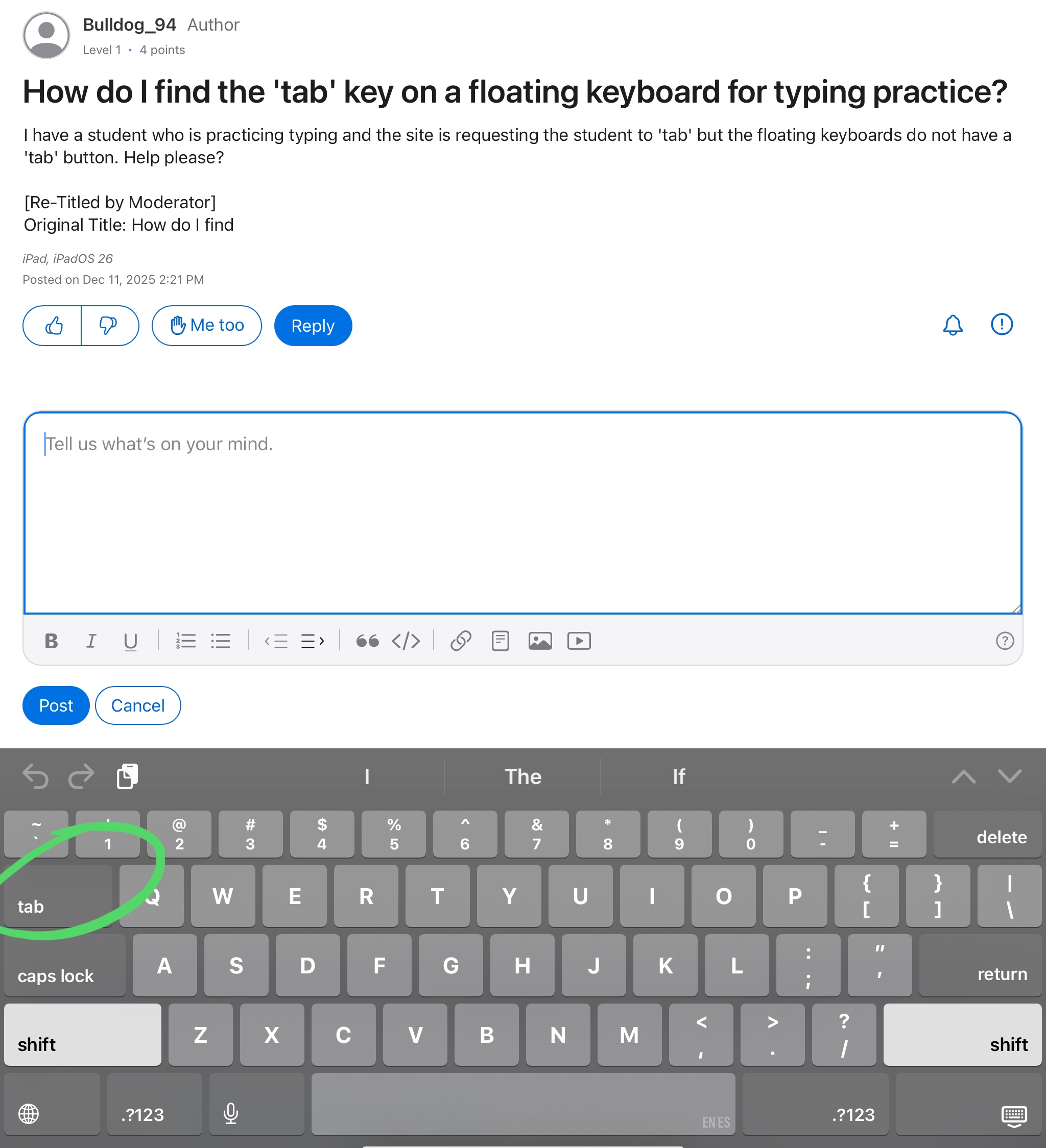 I have a student who is practicing typing and the site is requesting the student to 'tab' but the floating keyboards do not have a 'tab' button. Help please?