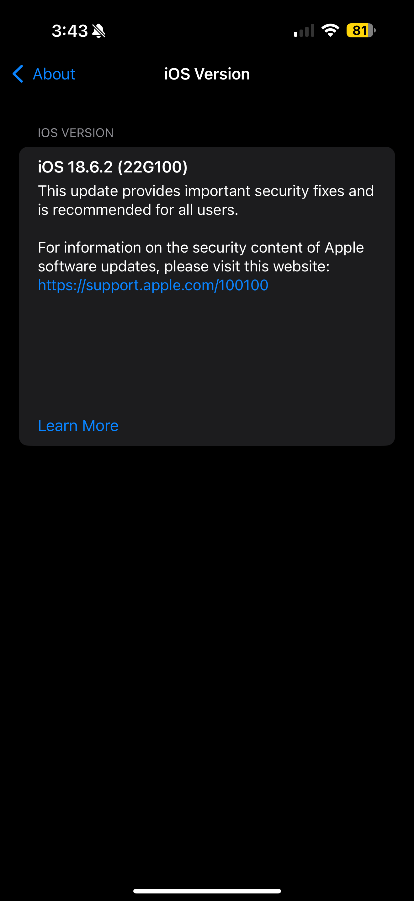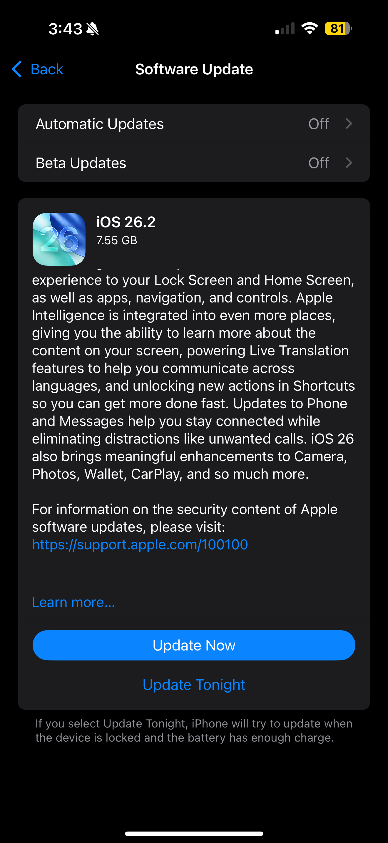 I have an iPhone 16 Pro Max, I’m on iOS 18.6.2, I’ve been wanting to update to iOS 18.7.2, but I didn’t want to. Today, iOS 18.7.2 disappeared for some reason. Idk how, but I’m still on 18.6.2 OS, and it’s now forcing me to update to iOS 26.2.