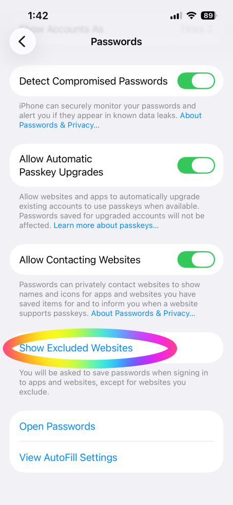The “Show Excluded Websites” option under Passwords on an iPhone appears only if you’ve previously chosen not to save a website’s password in Safari for a website.