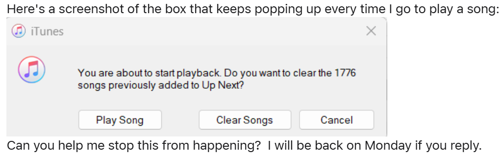 - if you click on Play Song, iTunes will play the song you've just double-clicked on and then continue with the Up Next list. Again, it does not delete any songs or Playlists from your library