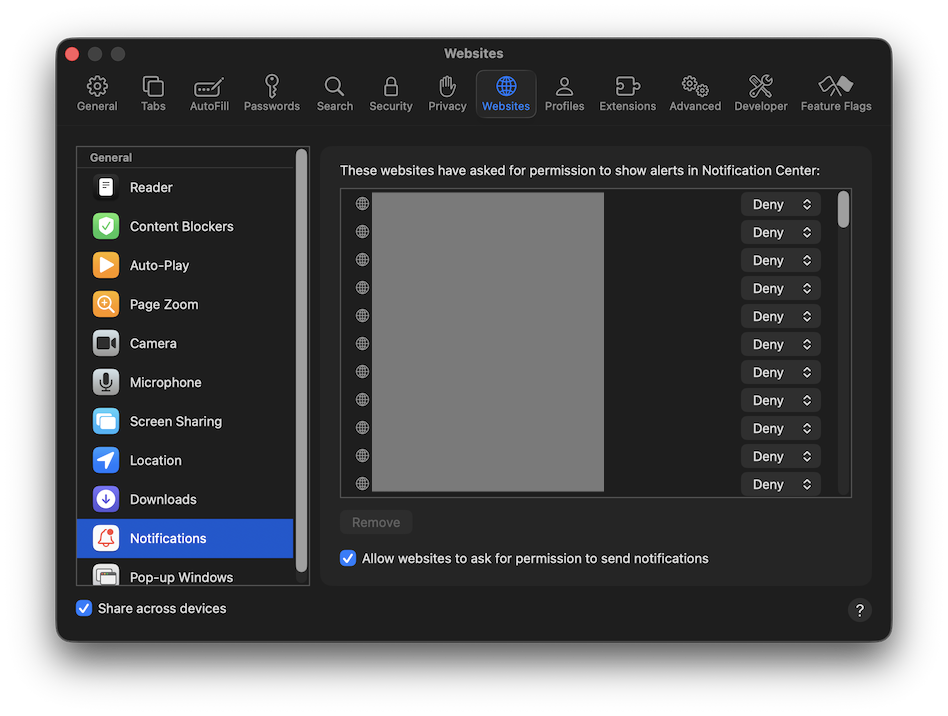 Also in Safari->Settings->Websites, make sure to disallow any notifications from websites that you don't want: