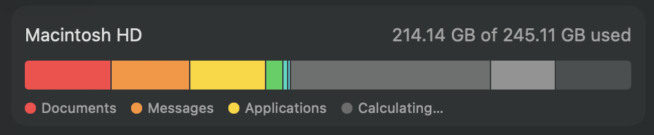 Hello. My Mac has been struggling with storage, and whenever I look at the storage in settings, it never finishes calculating around 80.9 GB, even when I leave it for hours. I suspect it might be because a couple of years ago, in order to back up my photos from my phone, I went and imported them into the photos app on my Mac, and then copied the photos library from my Mac with the imported photos directly to my flash drive (I copied the photos library file itself directly from my mac, and then deleted it off my mac when it was done copying. I didn't export the photos.). Would this be the cause of the issue? How can I resolve this issue and get the 80.9 GB of space back? (which would be very valuable space for me as my Mac has 256 GB of storage)