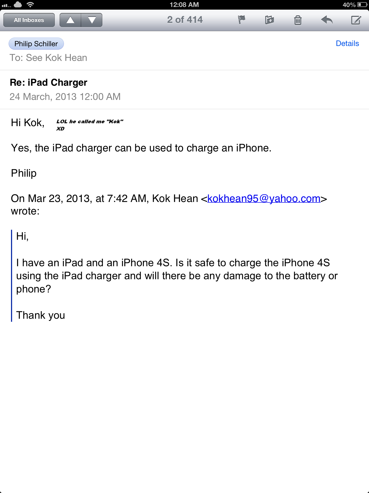 Their was another post about this charging issue and I explained it all basic on my educational level with electronics. Their were some people who turned it into and utter and complete joke. 99% had no electronic background but made tons of dumb comments. As the post went on a couple people that were using the iPad charger on their iPhone ruined their iphone battery. Once these people started posting that these people stopped with their stupid replies. the reason volts, watts, and amps are put on chargers are for a reason or else why would they put them on.