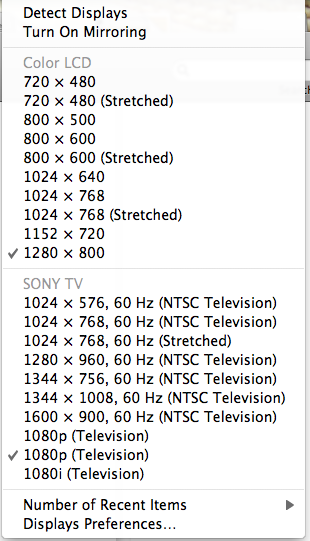 Of course, in mirrored mode, I can only set the TV to 1280x960 max, which is closest to the native 1280x800. Odd choice since this is 4:3. 1280x720 would have given 16:9, which is also what 1080p is, and hence, most people's TV.