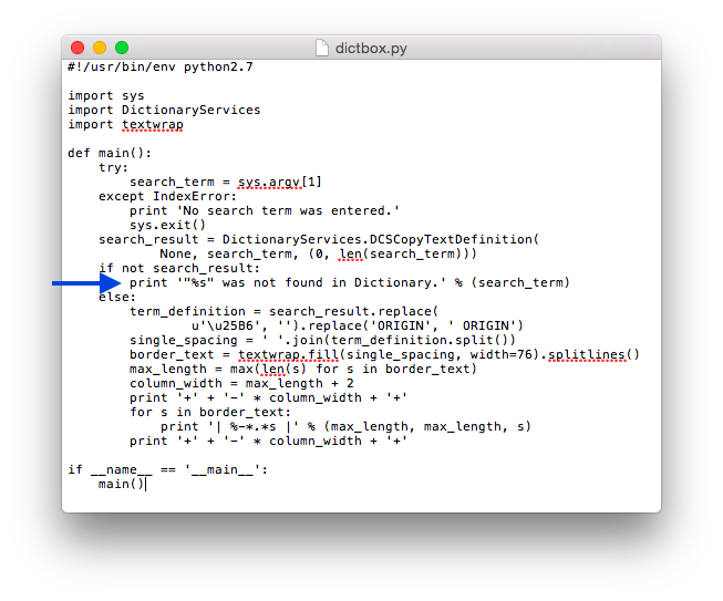 Hi KcidKcus. You're welcome; I glad you found the script(s) useful. I posted revised versions of dict.py and dictbox.py with the same links which you may want to download. They fix some indenting and support for accented letters. No need to revise your ~/.bash_profile, just replace dict.py or dictbox.py in your Scripts folder. Btw, for search terms other than single or hyphenated, use double quotes ("") or escape using the backslash (\). If you copy and paste, a phrase for example, you can paste with the Control-Command-V keys to paste escaped text. Some examples:
