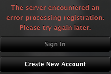 "The server encountered and error processing registration. Please try again later."