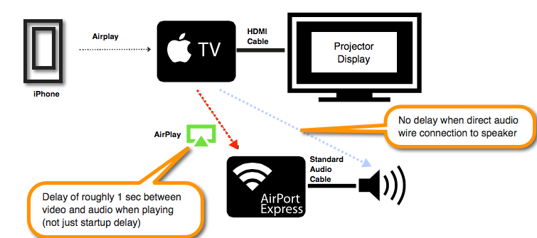 Background: Prior to the Denon, here was my setup. iMac connecting wirelessly to Airport Extreme base station. Airport Express connecting to printer and additional set of speakers via the 3.5mm analog optical cable. When I play music from my iMac speakers and use Airplay to play also to the speakers attached to my Airport Express, the music is in sync and awesome. Love it. Syncronized music in multiple rooms of house. Praise Apple.