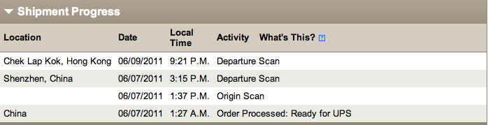 | 2011-06-07 20:08:00 | Package received after FedEx cutoff time | SHENZHEN, |