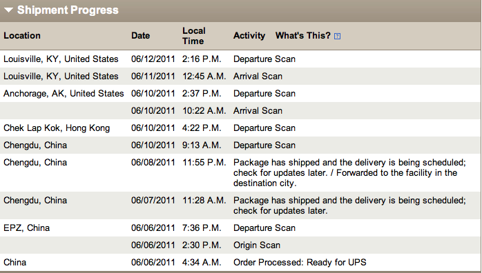 | 2011-06-09 20:52:00 | Package received after FedEx cutoff time | SHENZHEN, |