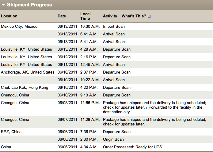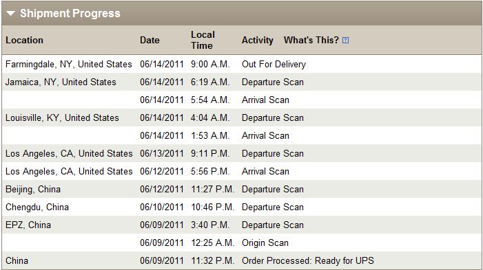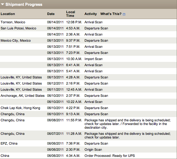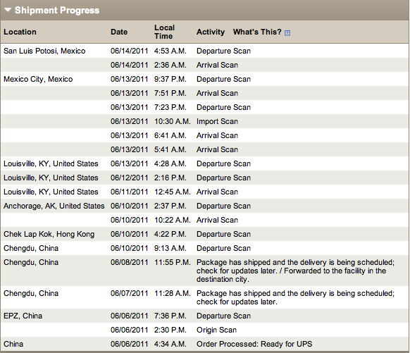By the way, the 6/12/2011 5:56pm Los Angeles, CA arrival scan showed up on June 13 around 5pm. Weird.