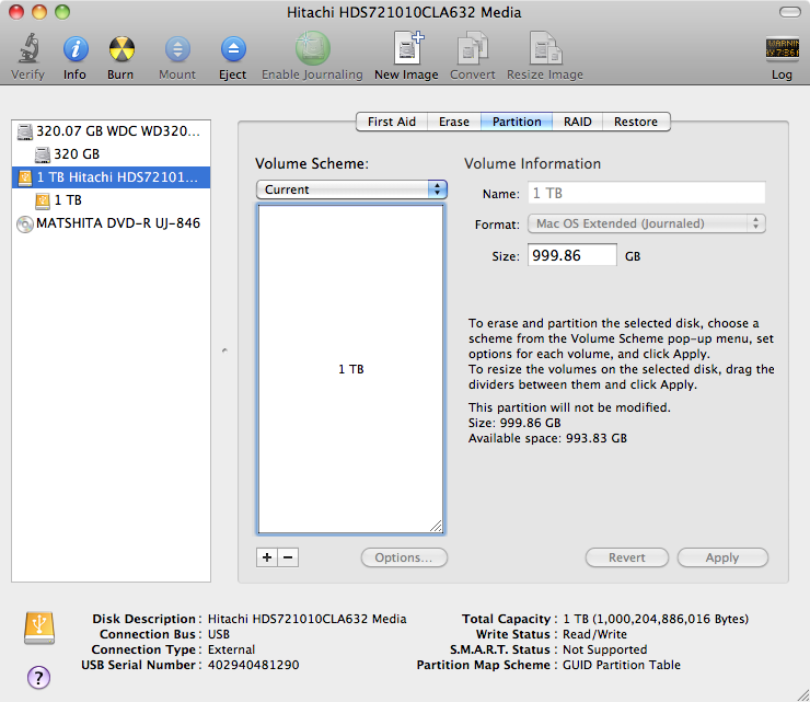I just acquired an older Power Mac G5 (dual 1.8GHz) and am going to use it as a home server to replace my even older MDD. I am having an issue getting my G5 to play nice with a Hitachi 1TB hard drive I had laying around from a working pull. The model is HDS721010CLA632 and can be found on this page (hover over the "specifictions" tab and information about this family of drives [7K1000.C] will reveal itself). I have confirmed that it is working and "healthy" per Disk Utility's report. I have tried everything I know how to do, but this thing simply cannot and will not be read by my G5. I have also confirmed that it's not the SATA cables themselves, as I've tried the power and data cables in both bays with this drive as well as other known working drives — and the cables definitely work.