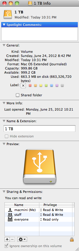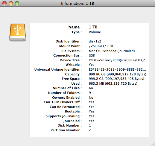 I have also gotten a Finder "Info" (apple-I) on the drive, which you will also see attached (also hopefully below). Is there anything else I should hunt down and check?