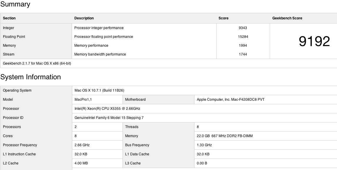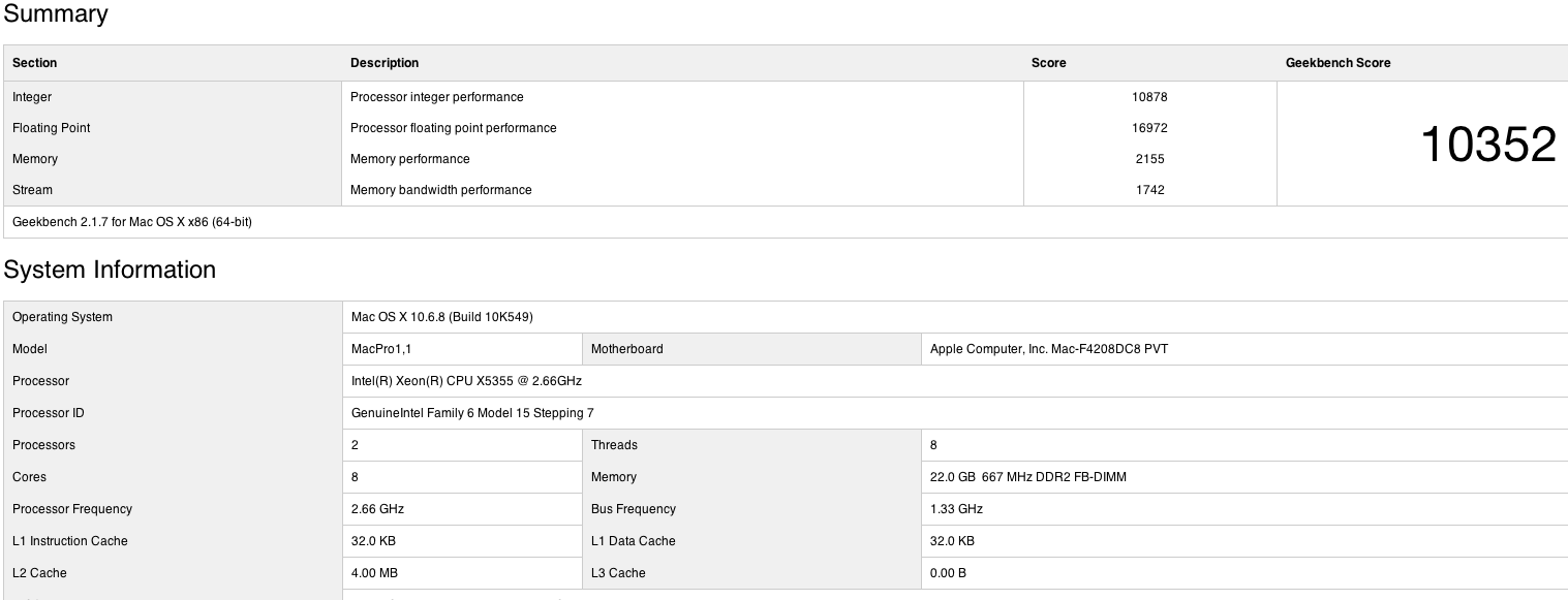 I have a mac pro v.1.1 (2006) with 2x 2ghz core duo (intel 5130) 8gb ram, 4tb HDD.