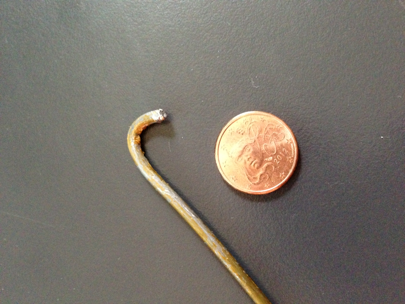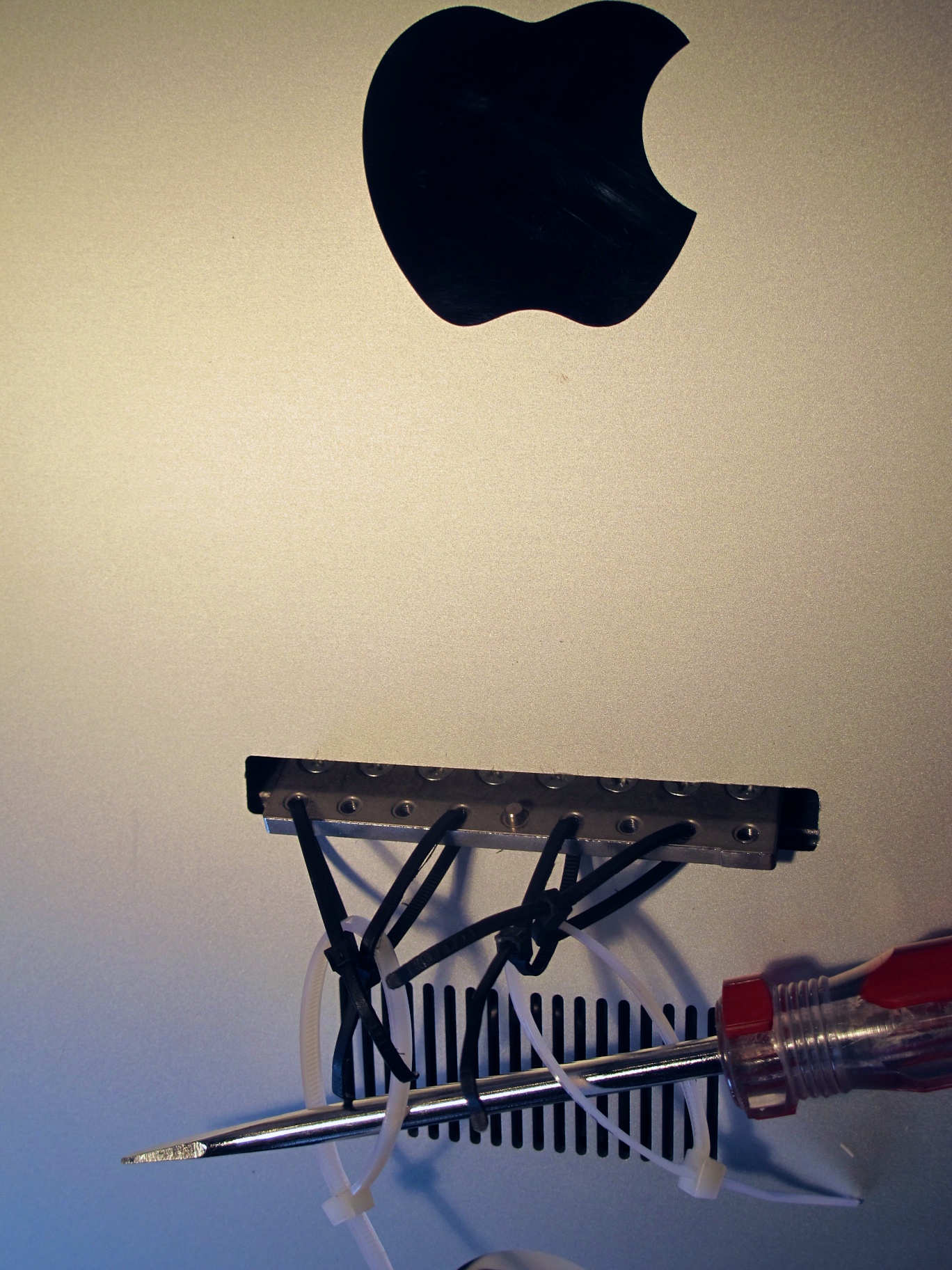 1) Find electrical wire, the bigger the better (so long as it fits in the screw hole). Use the needle nose pliers to feed one wire through each hole and lead both out of the gap. These will be permanently installed for stability so don't use something too thin and try not to move it around too much.