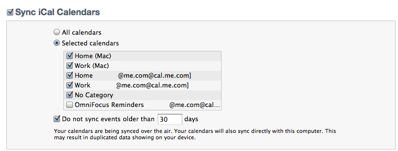 Here's some screen grabs of the settings I use. I do not use the online iCal calendar. My iphone is synced to outlook and the local ical calendar hosted on my laptop.