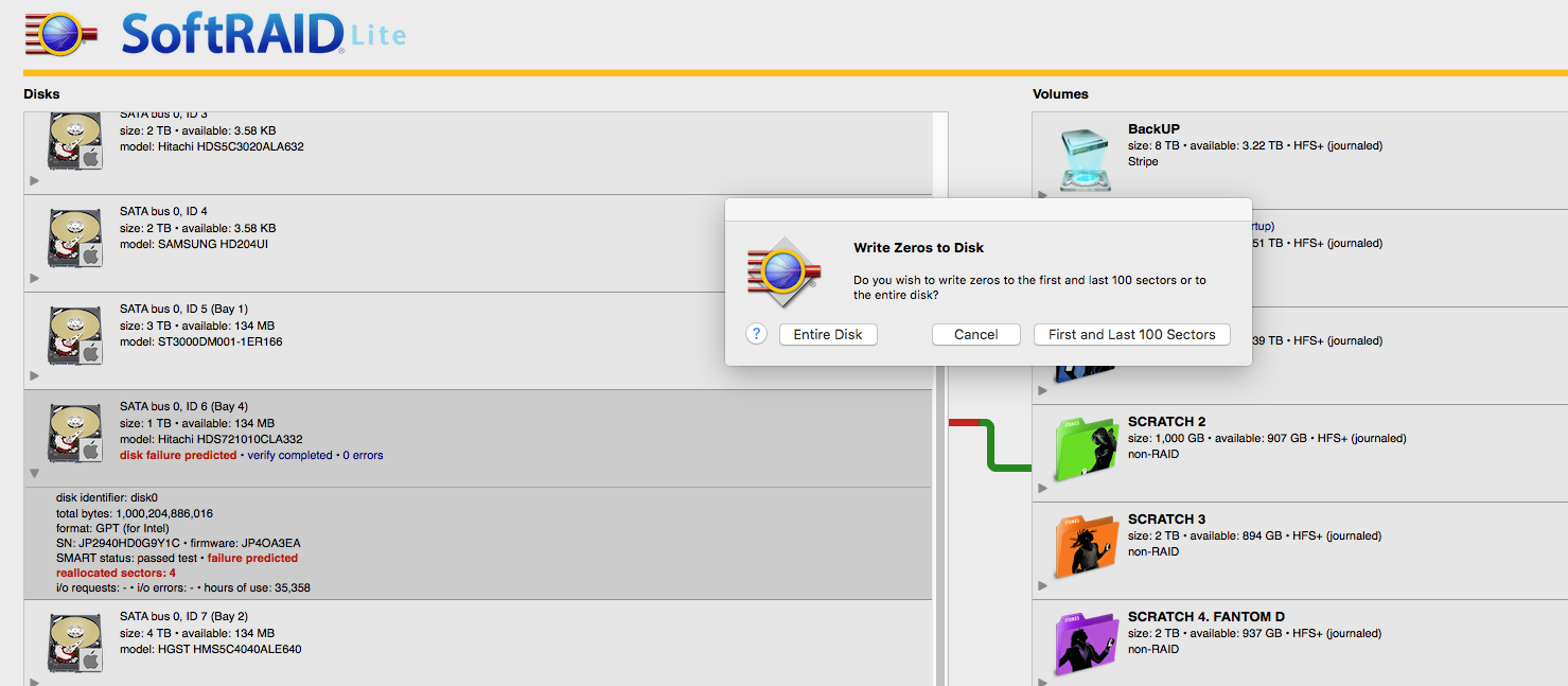 Last post on this was March 2016. Hopefully I get an answer. But I just bought SoftRAID for my Mid 2010 Mac Pro running El Capitan, four internal SATA, and an external JBOD SansDigital RAID box with Sonnetch Tempos Duo. I'm curious about using the SoftRAID Write Zeros to first and last Sectors function. I see many saying it is a waste of time. I'm a video editor so backup is very important. I've been replacing drives the past month and I will replace these with the bad sectors since SoftRAID is recommending they be removed but I'm still curious about the Zeros to Disk function and if SoftRAID has a good reputation as software that is good at repairing drives vs. the Mac Disk Utility. Also, if I engage the Zeros to Disk function will it totally erase the drive or just write to those sectors leaving all my other data alone? On a side note, knocking on wood, these Hitachi, and Samsung, internal drives have served me well. And well past the average 3 year life span of drives. Serious work horses.