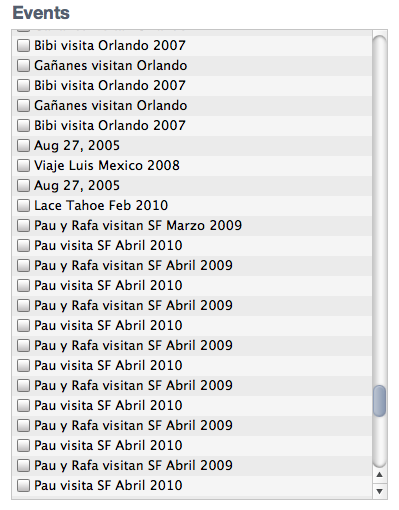 You see all those repeated events? Again, in my iPhoto application, the events show up as a single one, instead of multiple copies with the same name and only a section of the photos.