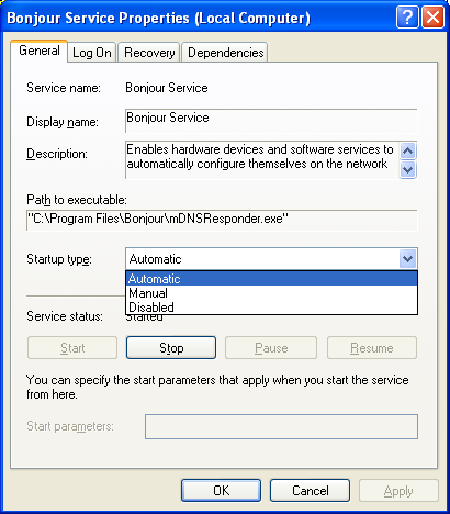 "To stop and start the Bonjour System Service, use the Windows Services applet. Disabling Bonjour is effective until the next reboot, when it starts up again." - from http://support.apple.com/kb/ht2250