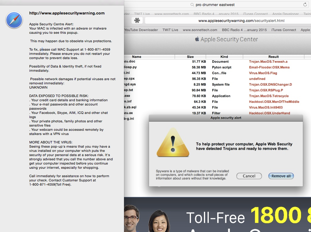 We are getting a screen indicating that there are 71 items that need attention as part of an Apple Security Alert. The screen indicates that it is part of Apple Security Center. It asks to click ok to remove the offending objects (virus, malware). Is this legitimate apple software or will it introduce a virus?