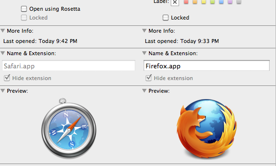 I’m running OS X 10.6.7 – Firefox 4.0.1 – Safari 5.0.5 and am trying to run 32 bit rate. I’ve gone to get info (both directly and thru above steps) and neither browser offers the “run in 32 bit mode” option. Firefox only offers “Locked” and Safari offers “Open using Rosetta” and “Locked” Am i doing something wrong? (all fields in “Get Info” are titlted open to see all contents)