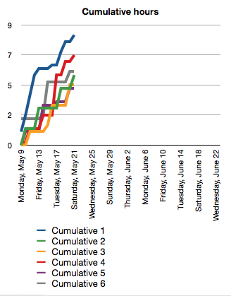 Ideally, the X-axis should be time/date.... May, June, July, and August can be the major tick marks. And the Y-axis would be number of hours spent on each activity.