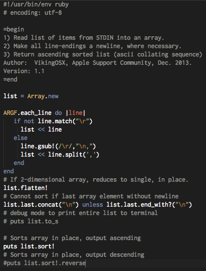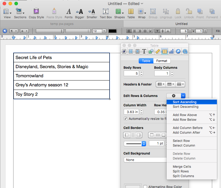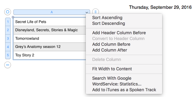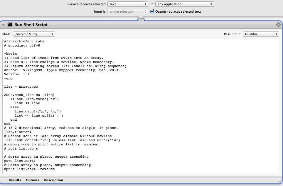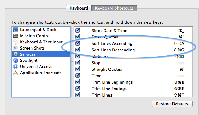 I digress: I then tried following the Dec 21, 2013 5:31 PM offering from Jerry - an update for Pages '13. I eventually arrived at completeing the sort both with or without WordService.service installed and along the way found that removing the WordService.service software removed the sort lines ascending and sort lines descending options from the Service list in System Preferences > Keyboard > Shortcuts > Services.