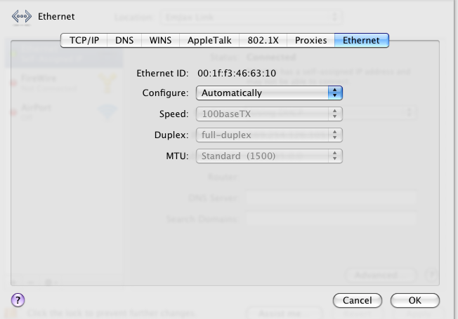 I have trashed all plist files that have to do with the network (and let the computer regenerate new ones). I then reconfigured the network and the settings in Network seem exactly the same.
