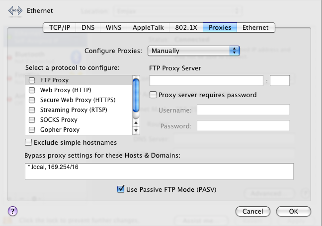 (Also, in Proxies dialog, I tried removing the info (*,local, 169.254/16) in the "Bypass Proxy Settings for These Hosts and Domains" and it would cause the "Configure Proxies" selection to default to "Always Use PAC File". Had to go back and retrash all the plist files to have Proxies go back to "Configure Proxies-Manually".