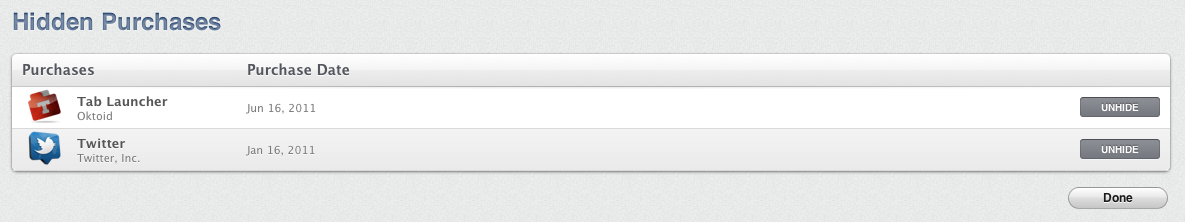 Removing apps from your purchase history is now possible in iTunes 10.5.