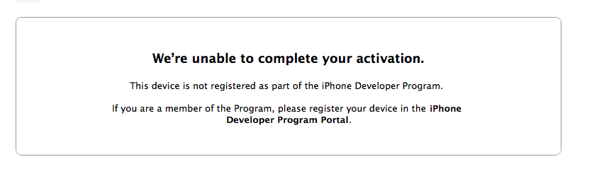 "We're unable to complete your activation. This device is not registered as part of the iPhone Developer Program. If you are a member of the Program, please register your device in the iPhone Developer Program Portal"